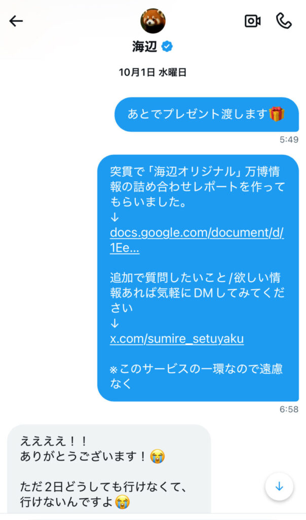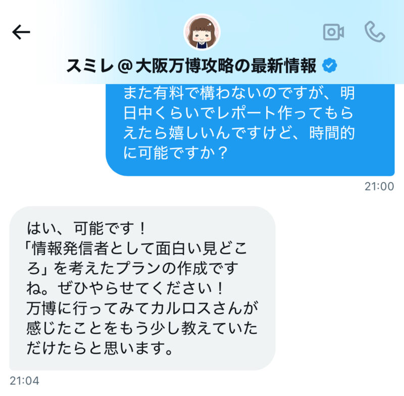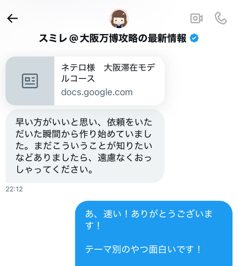 これを見て万博のスミレさんにネテロさん専用の万博プランを依頼