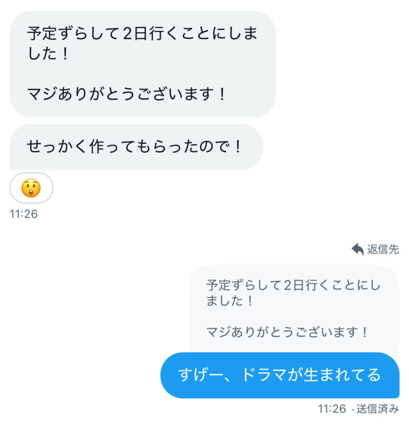 まあ僕も予定変更したってポストを見て勝手に作っちゃっただけなので「別に行けないならしゃーないよね」とは思ってたんですが、